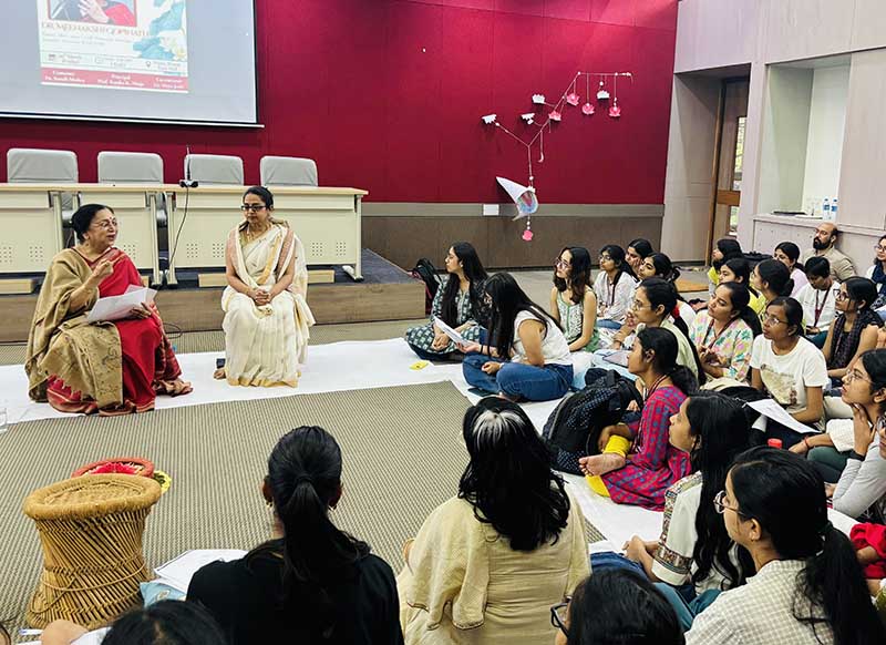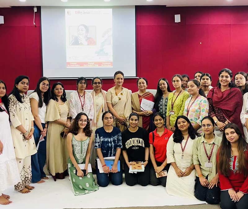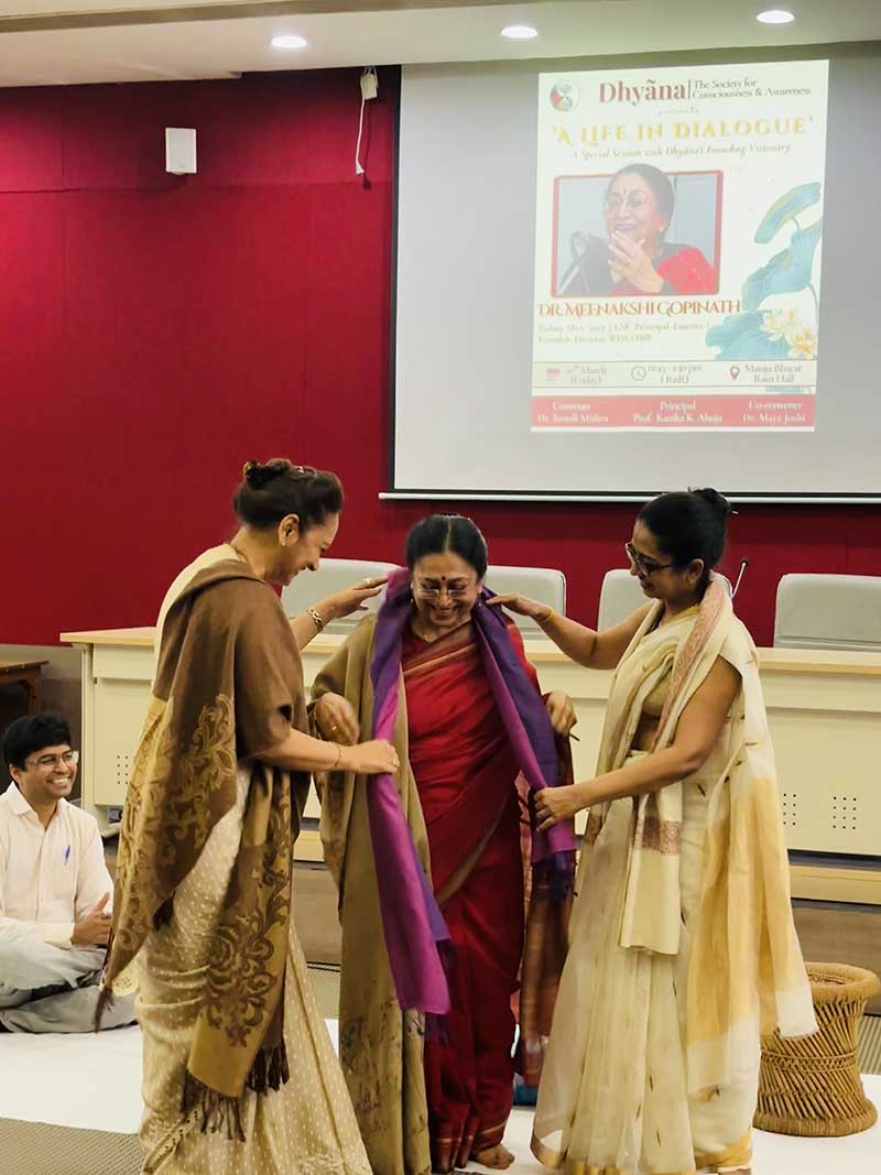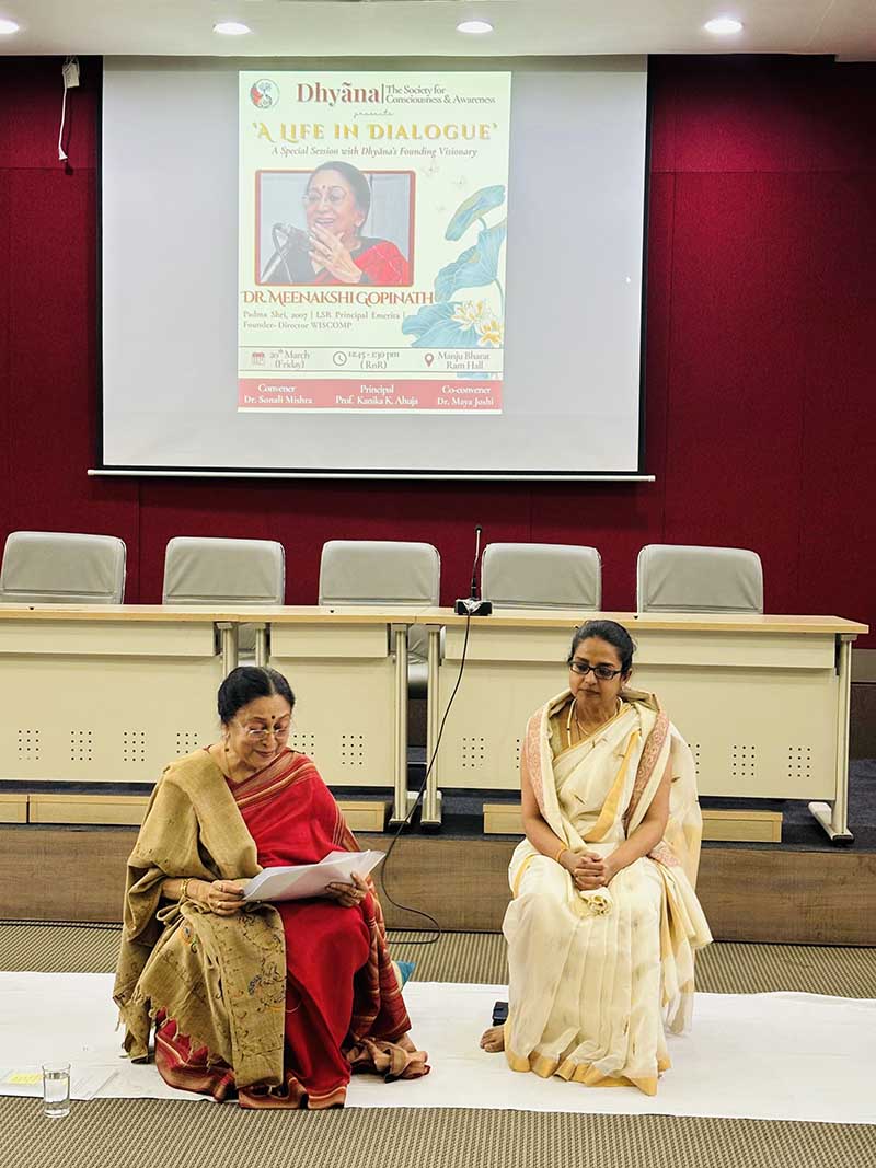 On March 20, the Society for Consciousness and Awareness: Dhyana organised an event ‘A Life in Dialogue’ as part of the annual conference series, featuring Dr. Meenakshi Gopinath, a founding visionary of the society and former Principal of Lady Shri Ram College for Women, founder and director of Women in Security Conflict Management and Peace (WISCOMP), and a Padma Shri recipient (2007). The event took place within the Lady Shri Ram College for Women campus, in the Manju Bharat Ram Hall, New Building. The attendees, including students and faculty, were seated on the floor, as preferred by Dr. Gopinath. The session began in the presence of Principal Kanika Ahuja and Dr. Sonali Mishra, convener of the Dhyana society.
