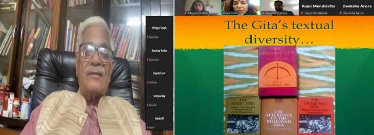 The experts invited for the course included Shri. Pavan Varma (former Diplomat, Author and Politician), Professor Girishwar Mishra (Former Vice Chancellor, Mahatma Gandhi Antarrashtriya Hindi Vishwavidyalaya), Professor Urmi Biswas (Head of Department, Psychology, University of Delhi), Professor Suneet Verma (Department of Psychology, University of Delhi), Dr. R.M. Matthijs Cornelissen (Sri Aurobindo International Centre of Education, Pondicherry), Dr. Jyotsna Kalavar (Professor of Psychology, Georgia Gwinnett College, USA) and Dr. Rashmi Singla (Associate Professor, Roskilde University, Denmark). Faculty members of LSR College, including Professor Smita Sahgal (Department of History), Dr. Maya Joshi (Department of English), and Dr. Megha Dhillon (Department of Psychology), also facilitated sessions. Several wonderful themes were addressed by the invited speakers. For instance, Prof. Kalavar discussed the relevance of the Gita in the arena of work, while Prof. Suneet Verma connected the Gita to modern practices of Psychotherapy. Dharma and the intersections of Buddhism were discussed astutely by Prof. Sahgal and Dr. Joshi, respectively. The course was appreciated by the participants for its novel, thought-provoking content and the rich knowledge imparted by the erudite speakers.