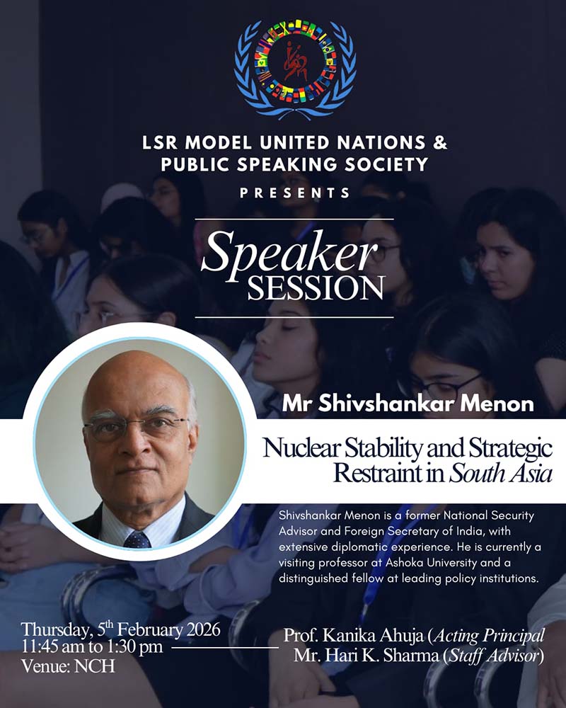 The LSRMUN and Public Speaking Society organised a thought-provoking speaker session with Mr Shivshankar Menon, former National Security Advisor and Foreign Secretary to India on 5th February, 2026 in the New Conference Hall. He eloquently explained the importance of nuclear stability, the use of nuclear bombs and the hidden incentives of nuclear test ban treaties, representing a larger dynamic of geopolitics. Focusing on the session’s theme, Nuclear stability and Strategic Restraint in South Asia, he asserted that nuclear power cannot be properly understood if it is confined to Asia alone, much less to the subcontinent of South Asia. This is due to the profound and far-reaching impact of nuclear power, which affects not only South Asia but also the regional stability of West Asia, Central Asia and the Indo-Pacific. He also discussed the case of Pakistan and explained how nuclear weapons enable asymmetrical warfare and lead to an increased concern for cross-border terrorism.