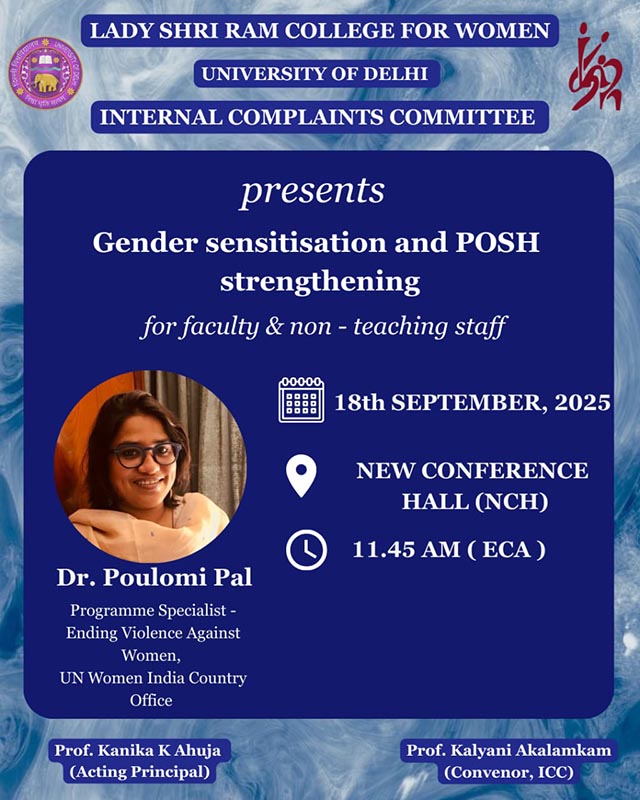 Internal Complaints Committee of Lady Shri Ram College for Women organised a workshop on ‘Gender Sensitisation and strengthening POSH’ for faculty and non-teaching staff on 18th September, 2025. The objective of the workshop was to foster a better understanding of gender related issues, promote inclusivity and equip all the stakeholders with knowledge and tools to prevent sexual harassment. The resource person for the workshop was Dr Poulami Pal, Program specialist, UN Women, India Office. Starting with decoding what is sexual harassment, the interactive session focussed on legal frameworks and preventive measures for the same. The resource person, highlighted the importance of respecting diversity, eliminating gender bias, and fostering a safe and equitable environment. The session covered key topics such as understanding gender roles, breaking stereotypes, handling unconscious bias, and the responsibilities of the Internal Complaints Committee (ICC). Case studies and real-life examples were discussed to enhance practical understanding. The session also focussed on gender responsive communication in the institutional contexts especially in the academic spaces and class room interactions. Participants actively engaged in interactive discussions and activities (video clippings) that encouraged reflection on personal attitudes and workplace interactions. Overall, the workshop was highly informative and insightful. It not only clarified legal provisions of POSH but also emphasized the need for collective responsibility in ensuring safety and equality for all.
